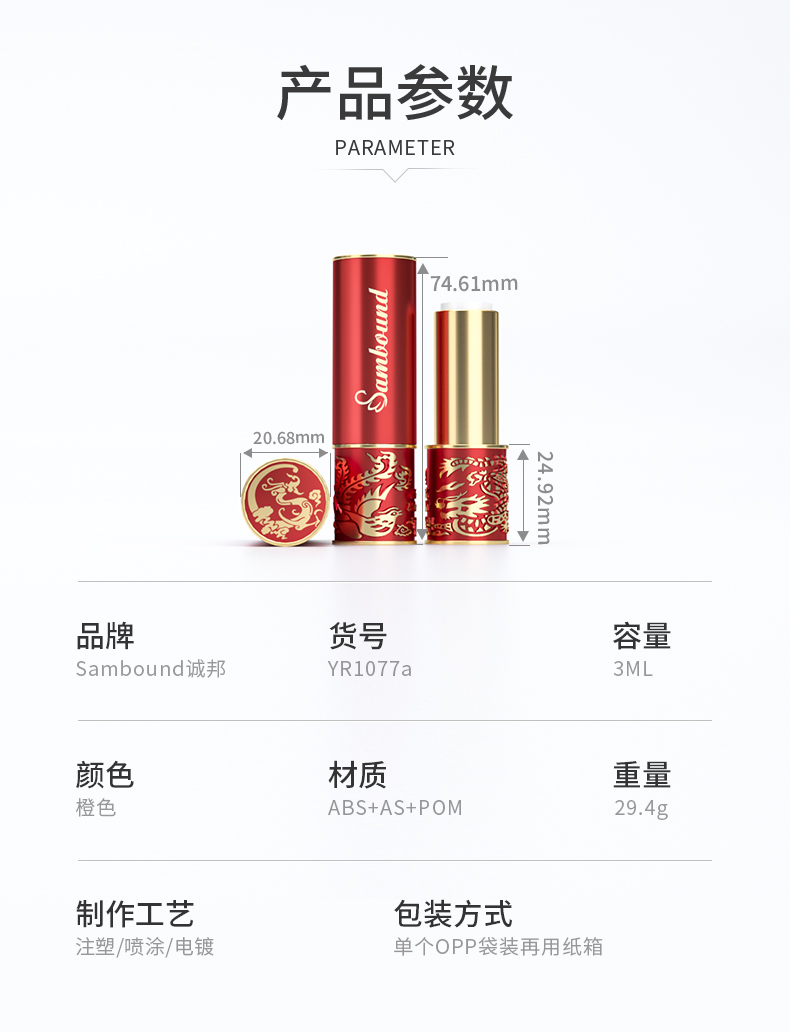 廠家定制圓形國(guó)潮風(fēng)口紅空管龍鳳口紅管包材,化妝品包材加工定制,我們可以做各種各樣的裝飾,從金屬化,hs,噴涂,uv涂層,電鍍等,也可以注射任何顏色
