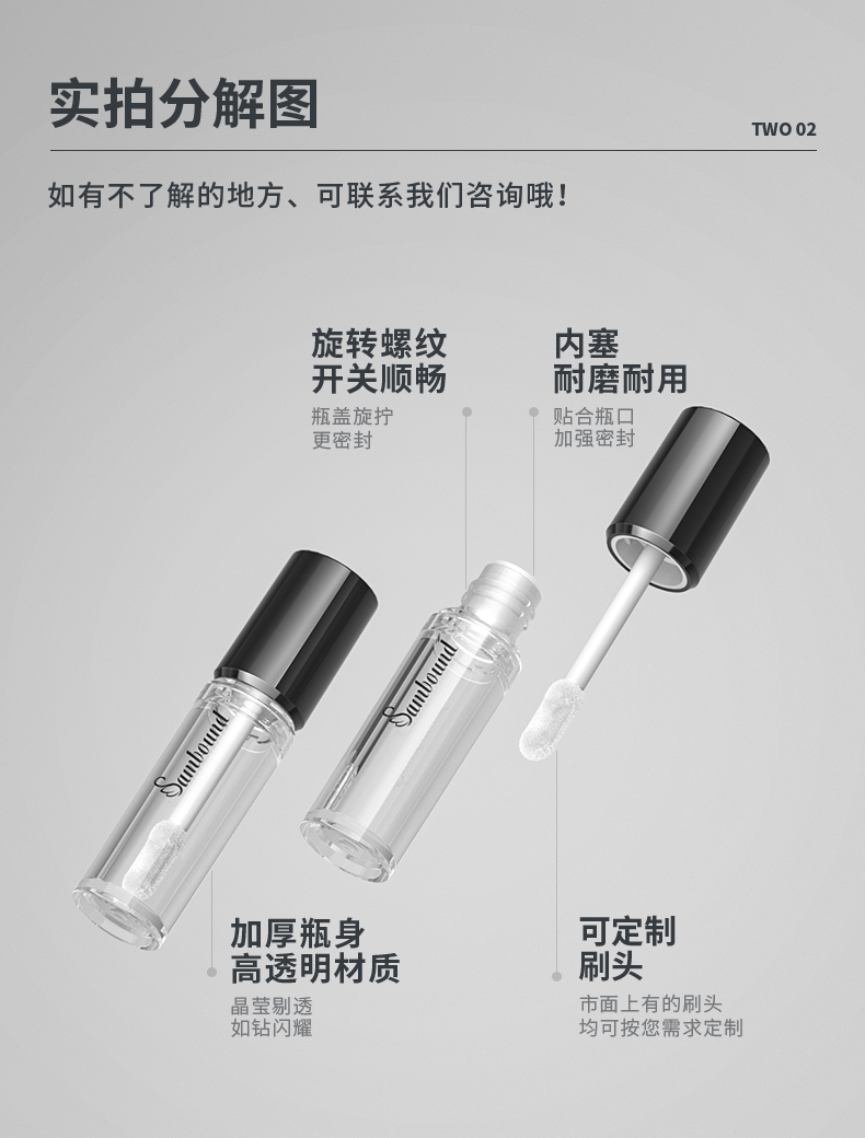 這款透明唇釉管4 7ml,可以定制顏色、絲印、注塑、logo以及其他的表面處理,誠邦化妝品包材注塑廠家也可以承接開模定制服務(wù)。