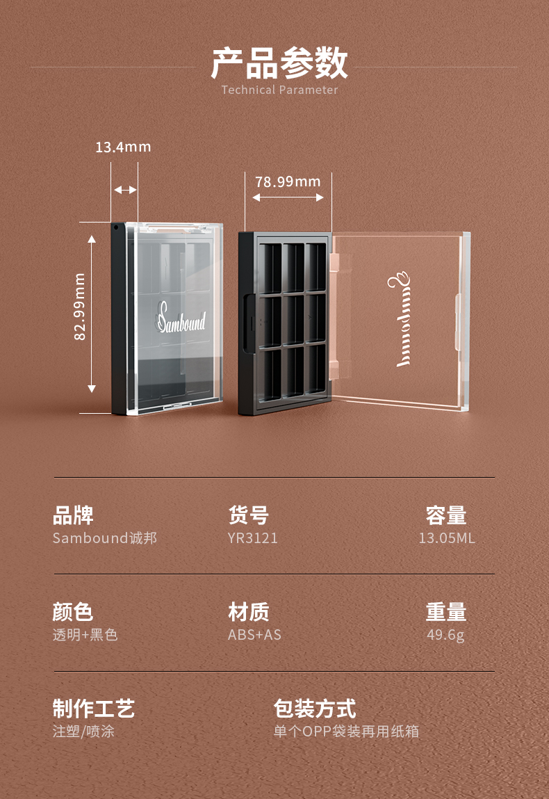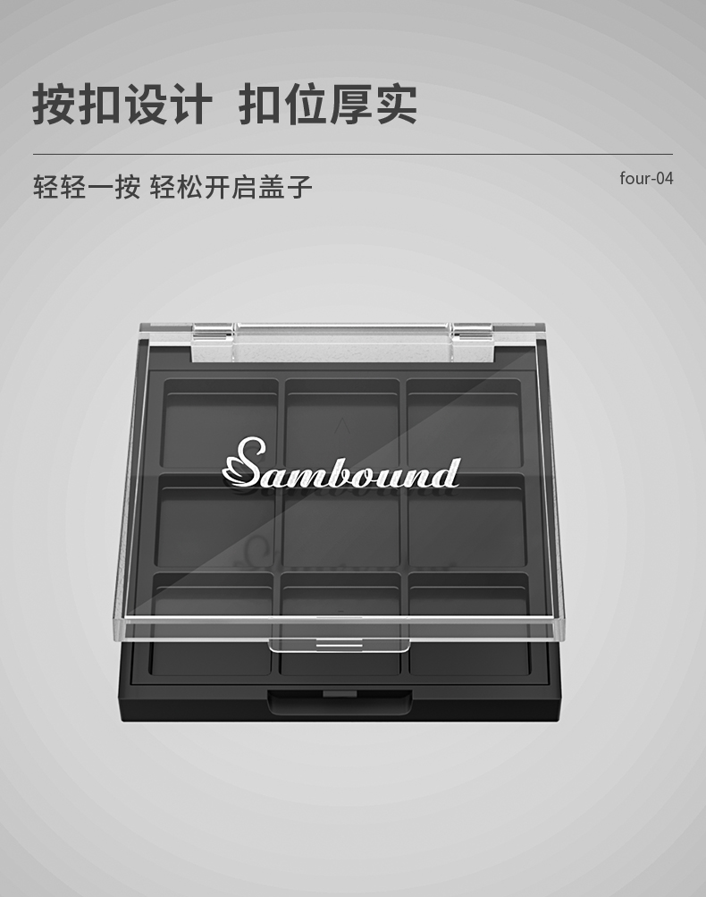 化妝品包裝供應(yīng)商定制方形透明9色眼影盤包材,該產(chǎn)品特點:透明蓋子、可定制logo、顏色及表面處理,采用按扣開關(guān),公模定制加工生產(chǎn)。