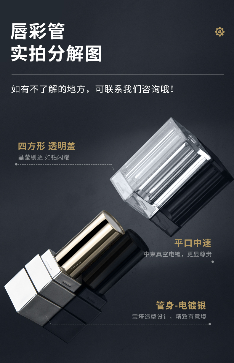 方形ABS塑膠口紅管空管,透明卡扣蓋子,管內(nèi)徑12 7mm,容量5ml,可按客戶不同表面處理工藝定制,工廠內(nèi)部完成電鍍,噴漆,絲印,燙金工藝。