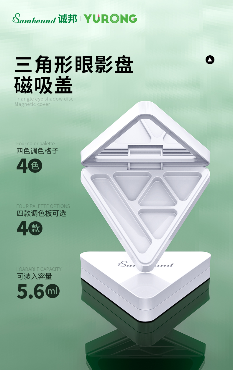 這款三角形磁吸眼影盤特點(diǎn):獨(dú)特的三角形外觀、磁吸開關(guān)設(shè)計(jì)、可定制logo圖案